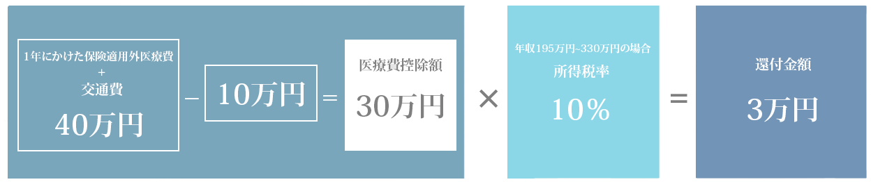課税所得300万円の方が年間で40万円の自由診療を受けた場合、還付金額は30,000円となります。